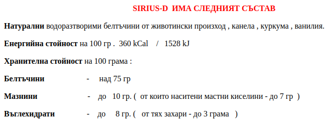 СИРИУС-Д е с уникалната формула създадена от професор Димитър Димитров .Тази лечебна храна - Сириус-Д е полезна – в направления в които съвременната медицина е в своето развитие.Целта на продуктите е по бързо възстановяване след преминаването на болеста или след оперативната намеса върху човешкото тяло.Чрез наслагвания от монопротеини и аминокиселини в човешкият организъм се засилват функциите на имунната система и започва засилен процес от възстановяване.Тази лечебна храна може да бъде консуми- рана от хора на всякаква възраст.Съставът от монопротеини и аминокиселини подпомага , ускорява процесите на възстановяване след оперативна намеса , травми , дегенеративни процеси , различни заболявания .
